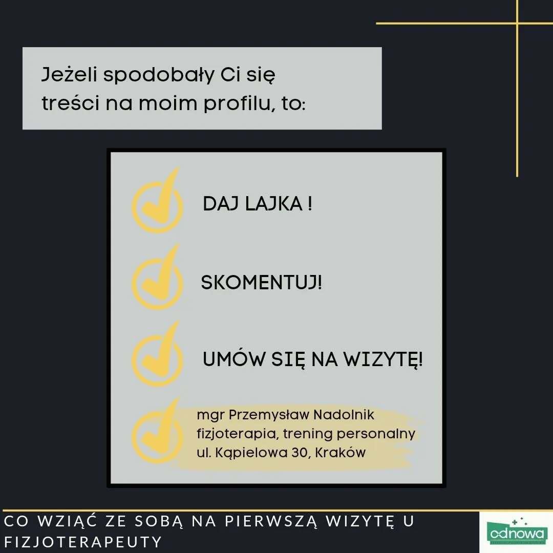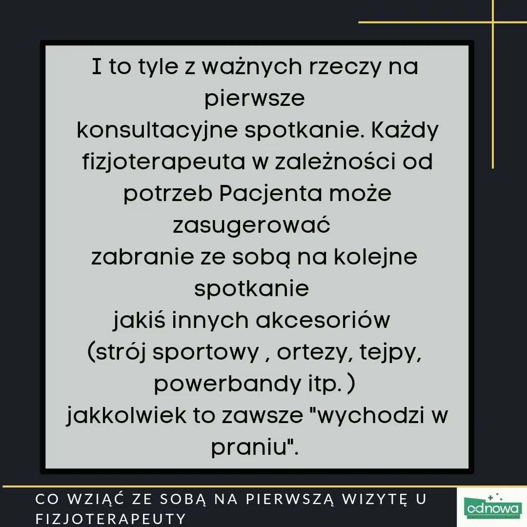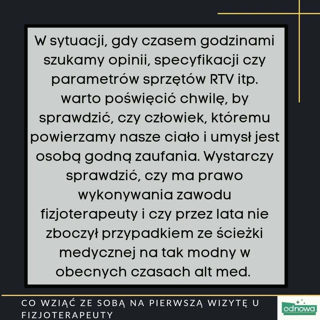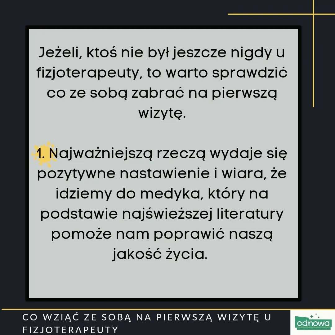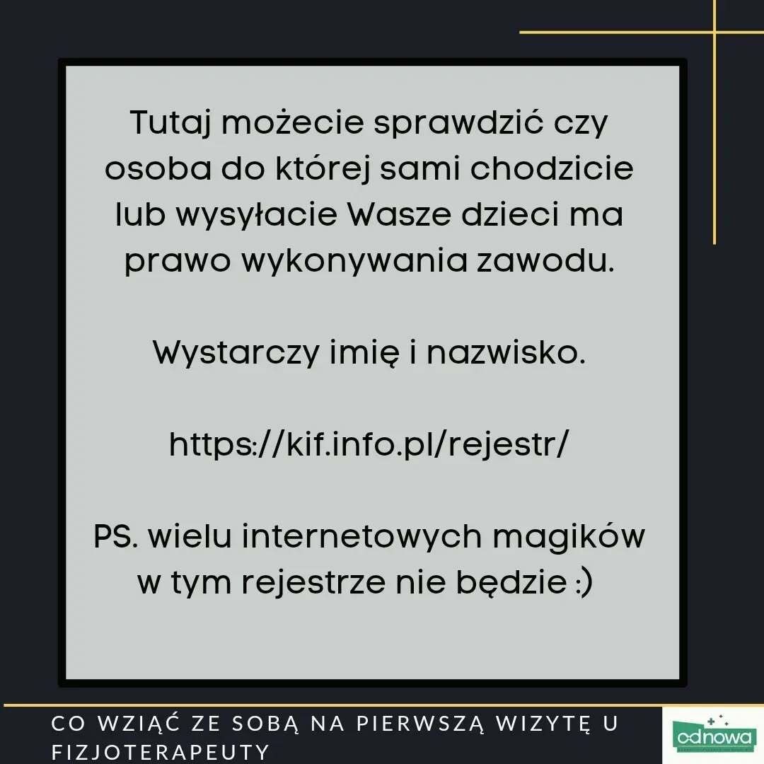 Co wziąć ze sobą na pierwszą wizytę u fizjoterapeuty. Gdzie sprawdzić czy fizjoterapeuta jest naprawę tym za kogo się podaje. M.in. tego dowiecie się z dzisiejszego wpisu. Po więcej treści zapraszam na instagram: @odnowa_nadolnik_fizjoterapia